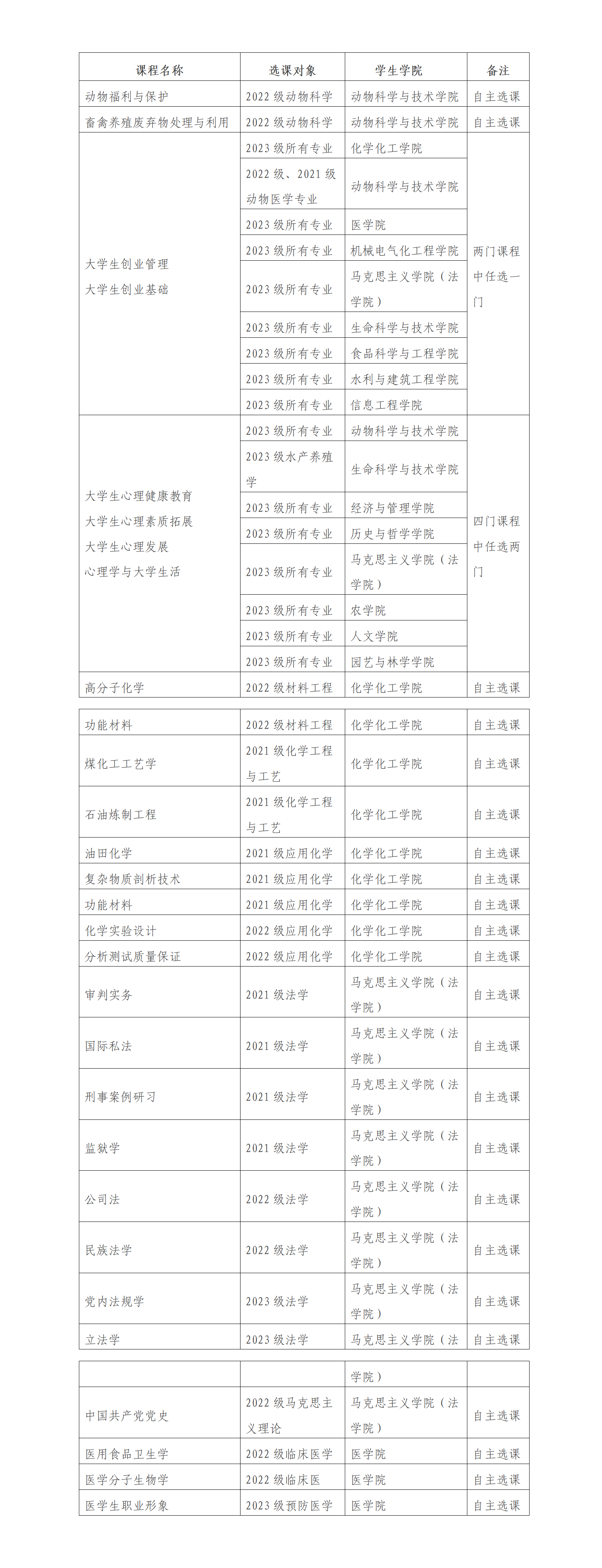 根据2021版人才培养方案,2021级、2022级、2023级有部分课程需要学生自主选课,现将2023-2024学年第二学期2021级、2022级、2023级本科生部分课程选课的事宜安排如下: