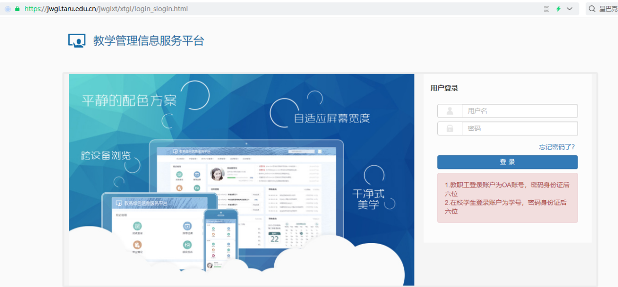 网址:选课网址为https://jwgl.taru.edu.cn/。选课的入口是教学管理信息服务平台,用户名是学号