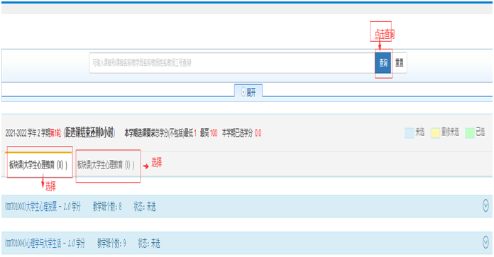 选课路径:“选课—自主选课”,点击“查询”,按要求选择课程。