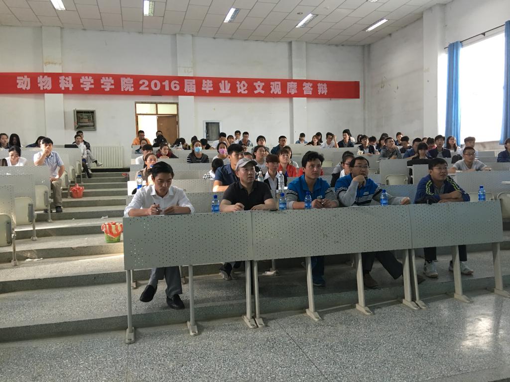 2016年5月21日上午,动物科学学院在综合楼阶教3举行了2016届学生毕业论文答辩观摩会。经学院选拔,有8篇论文参加本次观摩答辩。评委由邱德新、李有文、许贵善、席琳乔、魏杰和常卫华6名专家组成。教务处实践教学科科长王鑫、石建新老师亲临答辩现场指导工作。16届毕业生及部分17、18、19届本科学生100余人聆听了观摩答辩。答辩会由副院长邱德新主持,教务办主任高军担任答辩秘书。