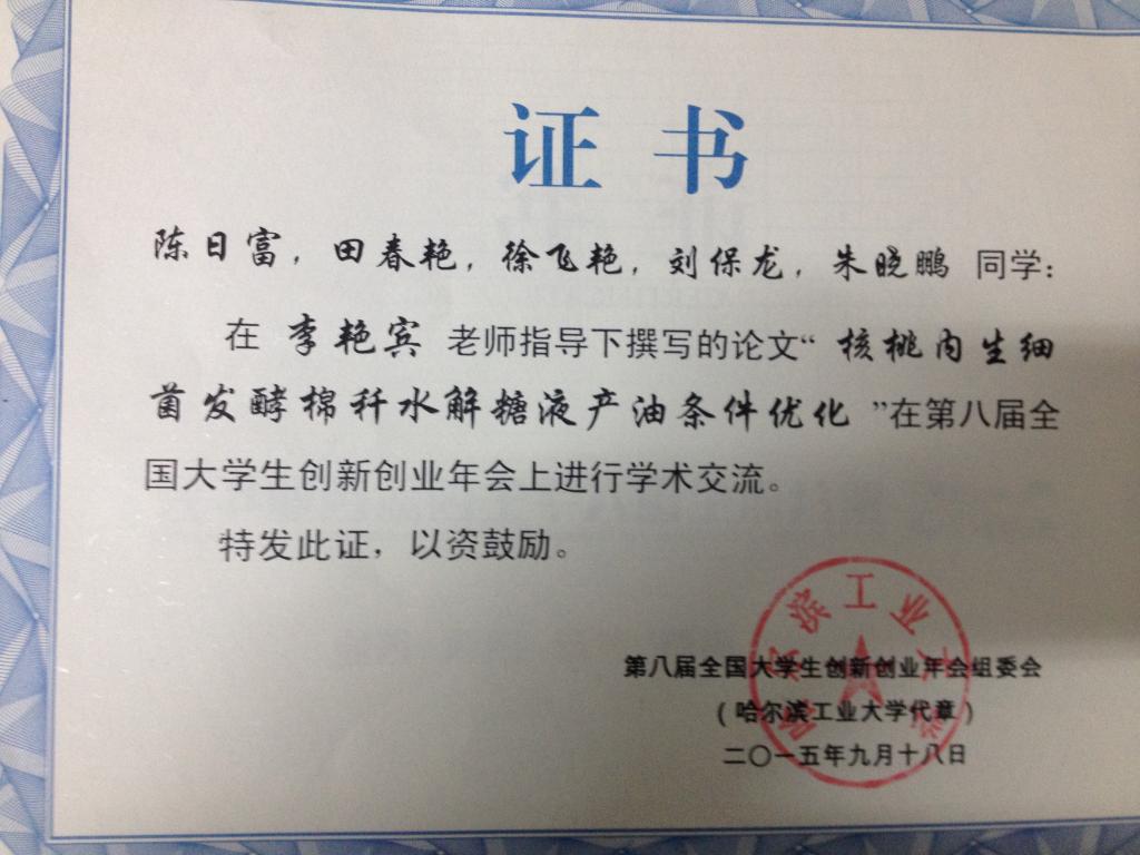 第八届全国大学生创新创业年会于2015年9月18日在哈尔滨工业大学召开,我校大学生创新创业项目的研究成果《核桃内生细菌HB1310发酵棉秆水解糖液产油条件优化》入选年会进行学术交流。